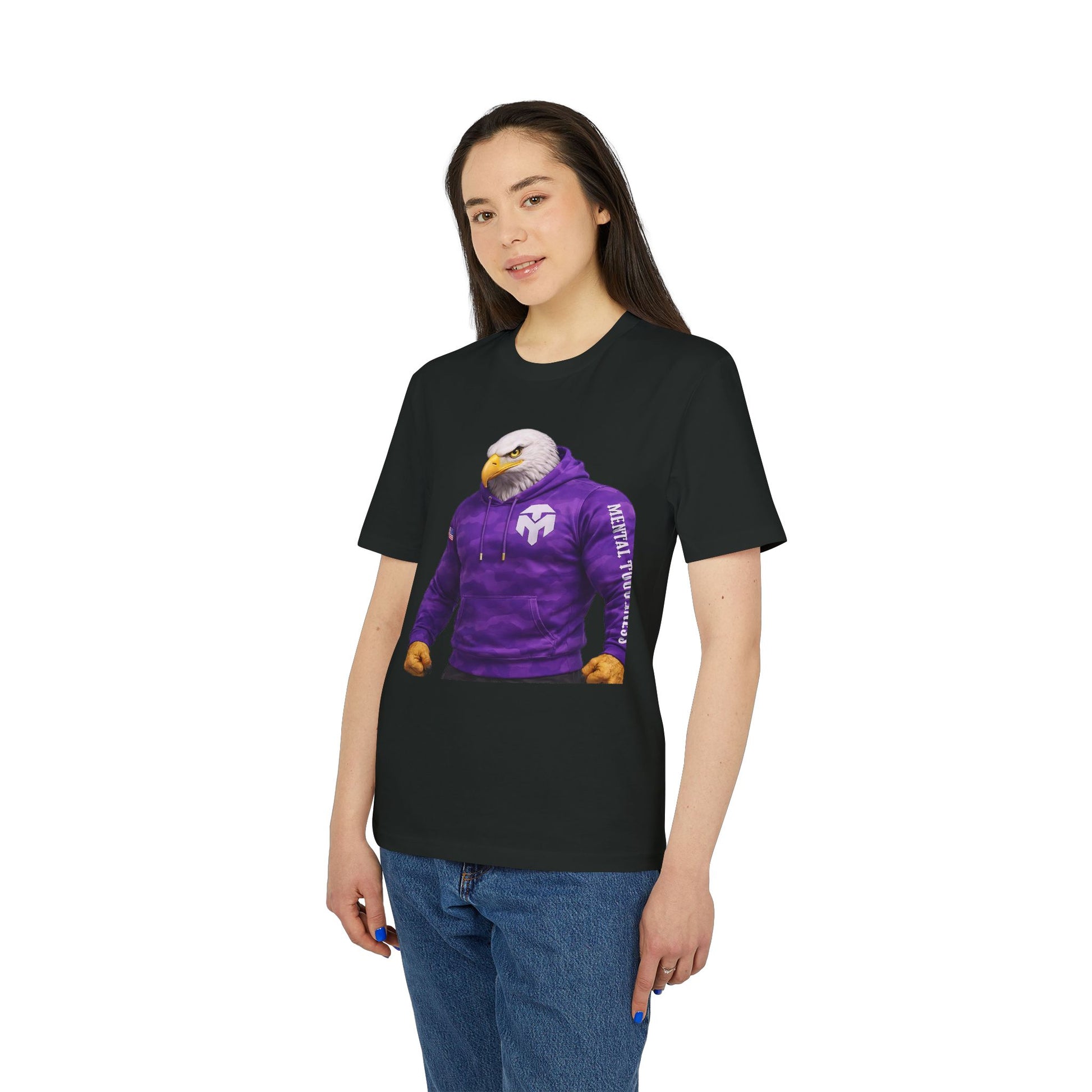 A soft, responsibly made tee that carries a touch of bold attitude. The front illustration — a muscular eagle in a purple hoodie — brings quiet humor and confident energy to everyday wear. Wear it when you want your outfit to feel grounded and a little playful: mornings with coffee, low-key hangouts, or casual streams and meetups. The medium-weight organic cotton drapes comfortably, the ribbed collar keeps its shape, and the tear-away label removes the itch so nothing gets between you and the moment. Subtle printing on the sleeve adds personality without shouting, making this shirt an easy pick for anyone who likes relaxed fits with a distinctive graphic.