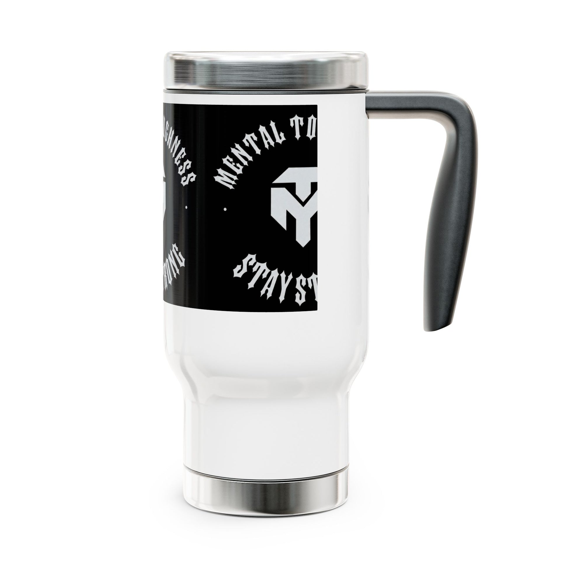 This 14 oz stainless steel travel mug with handle keeps your morning routine focused and steady. Double-layer construction and inner plastic insulation hold temperatures while the spill-resistant snap-on cap and secure screw-on base keep movement and mess under control. The glossy, full-wrap print shows bold black artwork and crisp white typography that reads like a personal mantra — a quiet, visible reminder to stay mentally tough during long commutes, gym sessions, or late-night study drives. Lightweight but sturdy, it fits most car cup holders and feels balanced in hand thanks to the molded handle. Bright, durable print and BPA-free materials make it an easy everyday companion for anyone who values resilience and function in their gear.