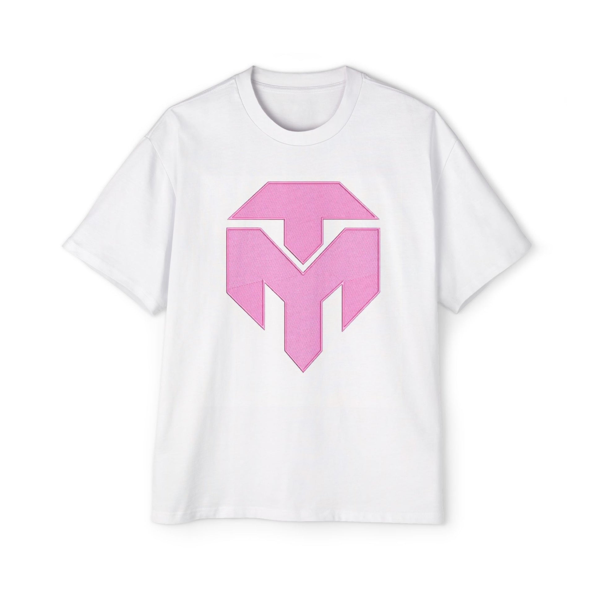 This oversized tee brings relaxed, street-ready energy with a clean, bold emblem printed center chest. The boxy silhouette and dropped shoulders read modern and effortless — easy to layer over hoodies or wear solo for lounge days. The midweight fabric has enough structure to hold the graphic while feeling substantial against the skin. Crisp white shows off the soft pink geometric emblem, giving a quiet, graphic statement that works for casual runs, studio hangs, or cool-day walks.